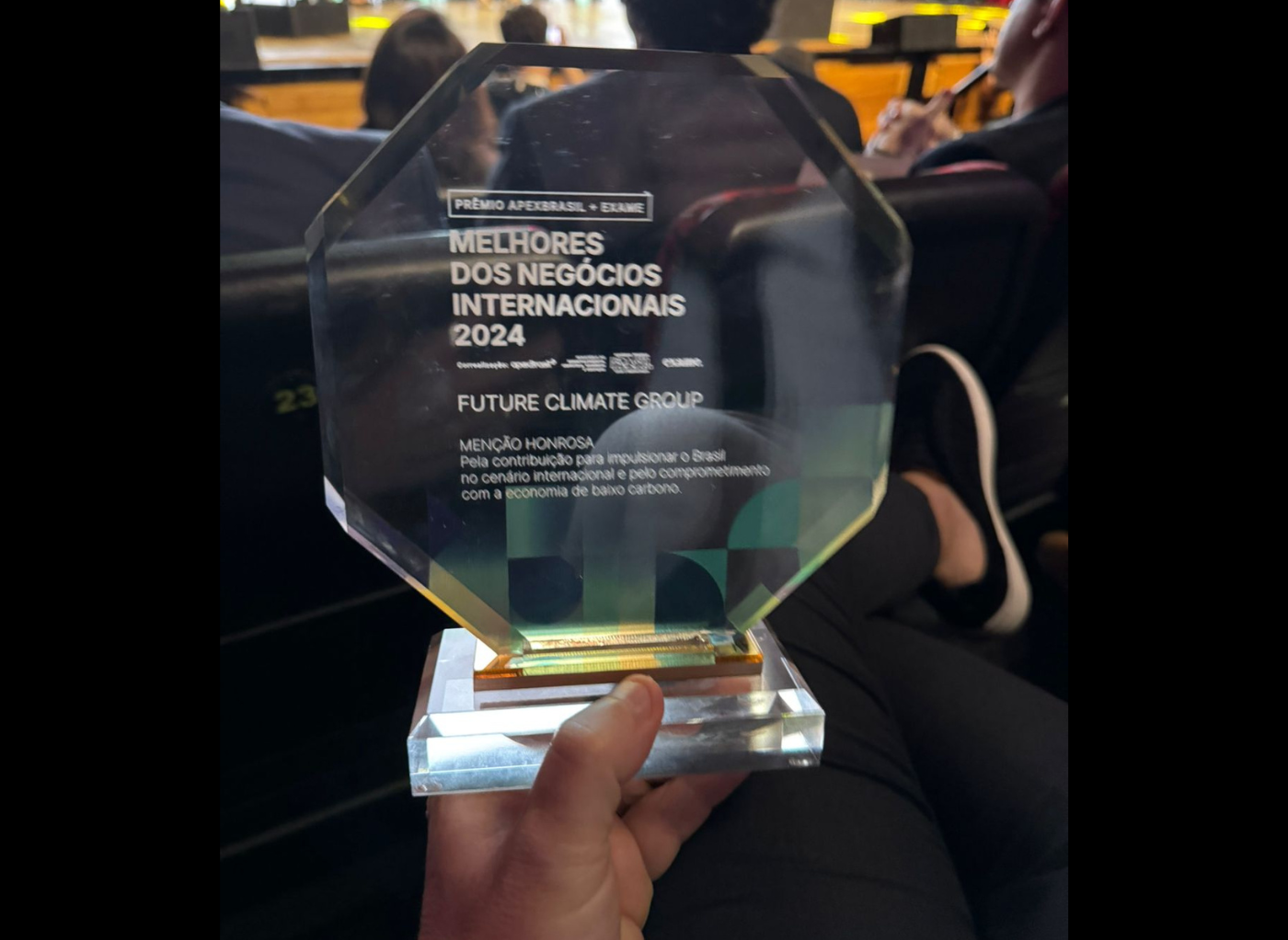 São Paulo, 10 de dezembro de 2024 – Nesta segunda-feira, a Future Climate recebeu a Menção Honrosa do Prêmio ApexBrasil-Exame, durante cerimônia realizada no Instituto Tomie Ohtake, em São Paulo. A Future Climate se destacou como uma startup inovadora que acelera a descarbonização e atrai investimentos globais voltados à conservação ambiental e ao desenvolvimento sustentável. Mas também por ter projetos que promovem biodiversidade, bioeconomia e impactos positivos em comunidades locais. Como é o caso do Projeto Rio Madeira, que conserva um total de 52 mil hectares de floresta nativa nos estados do Amazonas, Acre e Rondônia, atraindo recursos estrangeiros com a geração de créditos de carbono de alta integridade.